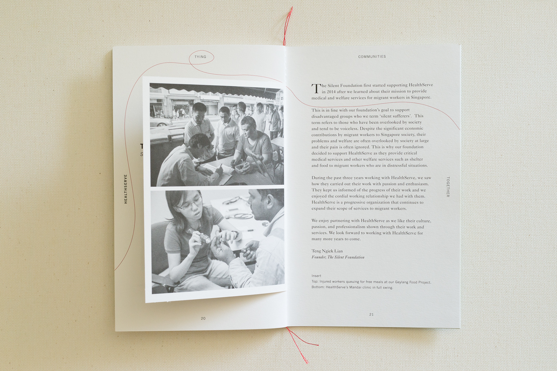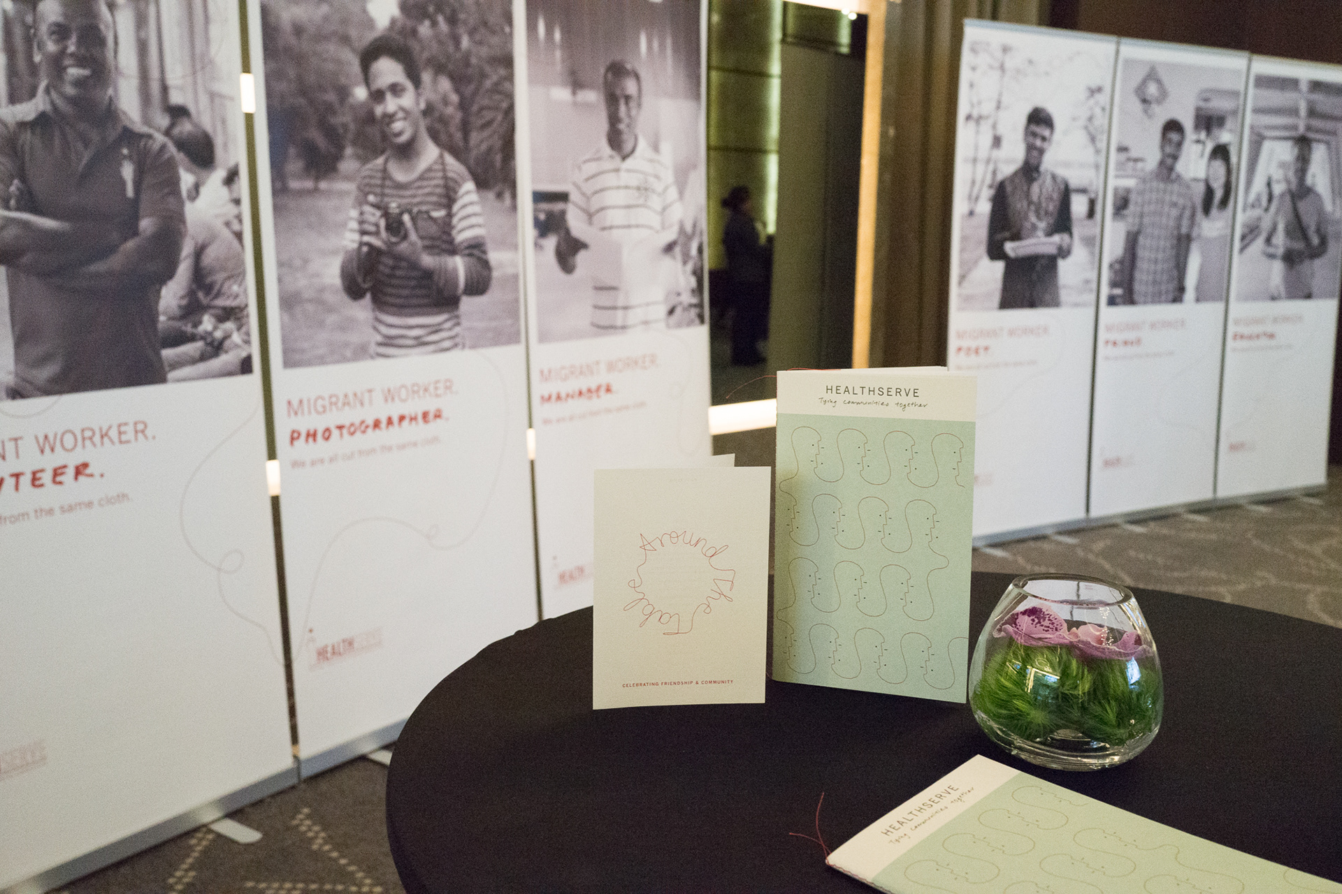 HealthServe is a charity organisation that helps to support migrant workers in Singapore. The fundraising gala dinner “Around the table” celebrates the concept of community & friendship. The brief was to share the work that the charity does and the effect it has on migrant workers. The idea was to use a connective red thread to represent how everybody is connected. A book was created to share stories & experiences from migrant workers and volunteers. Guests also each took home a loaf of bread as a reminder that migrant workers are breadwinners for their families. In addition, a series of posters was made for the event.